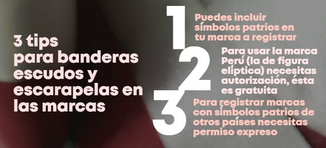 Por ejemplo, cualquiera puede aplicar en sus marcas la bandera del Perú, nuestra escarapela y el escudo nacional, e incluirlos en una marca a registrar, si rediseñamos estos elementos, este rediseño también puede ser registrado como parte de una marca, peru, si la autoridad considera que el rediseño afecta la imagen de nuestros símbolos patrios, puede denegarse el registro.
